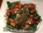 Fish with Pesto, Oven Roasted Vegetables on Bed of Spinach