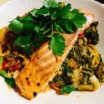 This recipe is superfood maxed with salmon, spinach, broccoli, zucchini and ginger. It is easy to do, and perfect for a light dinner – or to impress guests with their own individual bags that can be cut up at the dinner table.